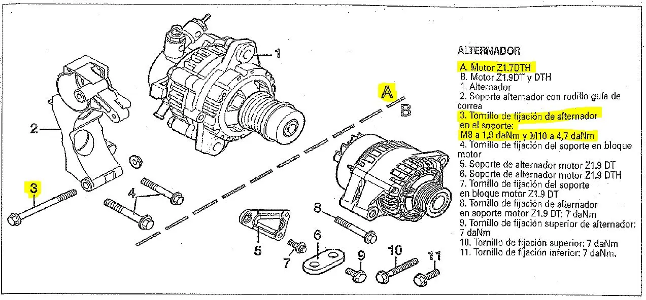 Ilustración Par de apriete del Alternador Opel Astra H 1.7 CDTI con Motor Z17DTH (100 CV), y 1.9 CDTI con Motor Z19DT (120 CV) y Z19DTH (150 CV).